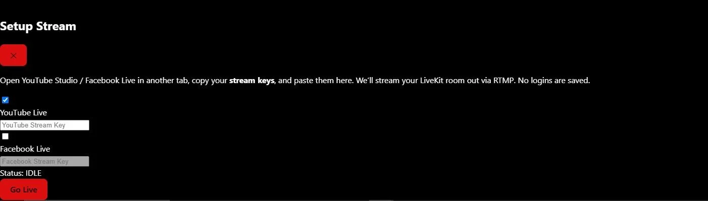 This creates a true one-click broadcast experience, the same style that big software like StreamYard, Restream, or Melon uses — but inside your own custom platform.